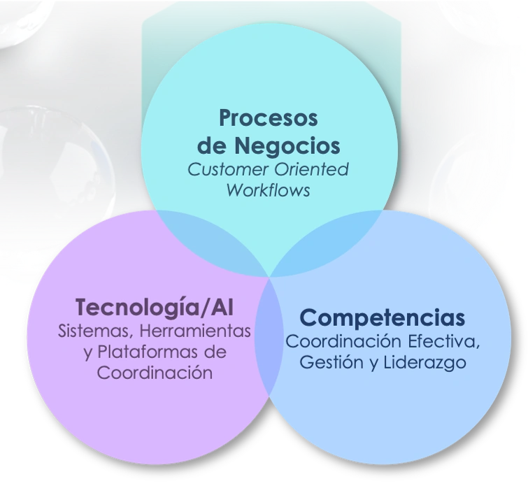 Diseñamos procesos de negocio y habilitamos plataformas y herramientas de coordinación para mejorar la efectividad y hacer más eficiente el trabajo de los equipos. Fortalecemos el liderazgos de roles clave y desarrollamos una cultura de cumplimiento e impecabilidad orientada a la satisfacción de los clientes.